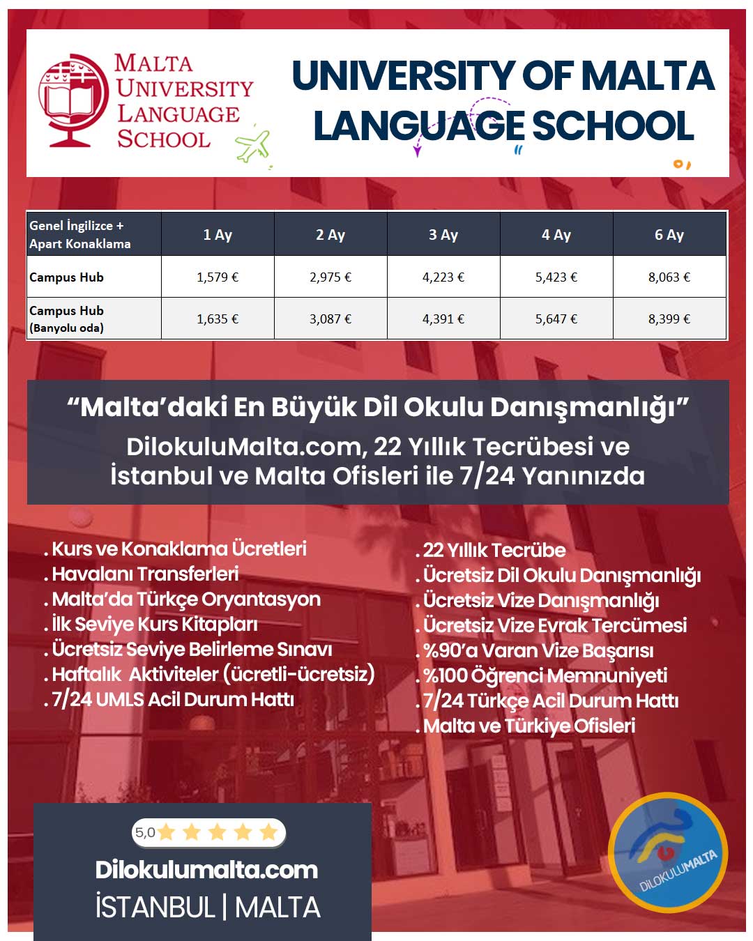 📌 Bizimle kayıt olduğunuzda okul fiyatları değişmez, aksine ücretsiz danışmanlık ve okul seçimi, ücretsiz vize desteği, konaklama organizasyonları, Malta’da Türkçe Oryantasyon, Malta ve Türkiye’de 7/24 destek gibi ekstra hizmetler kazanırsınız.